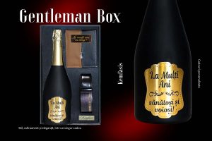 Setul conține accesorii premium pentru El și pentru Ea, completate de o sticlă de șampanie, toate prezentate într-un ambalaj deosebit.