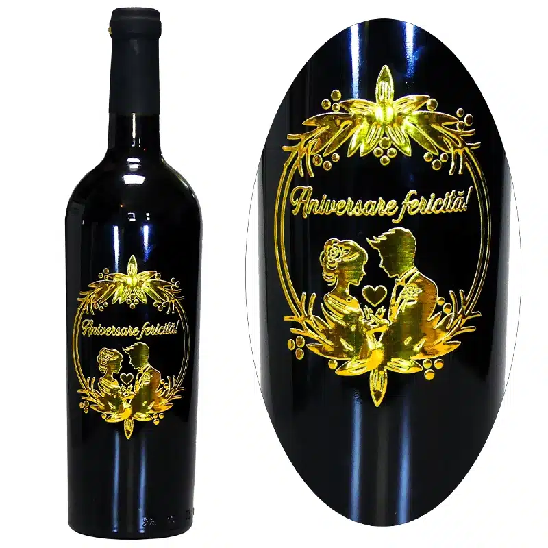 Binaria Wine Box – Aniversare fericita conține o sticlă de vin elegantă, cu etichetă metalică personalizată, alături de accesorii premium: portofel bărbătesc, portofel feminin și curea elegantă – toate alese cu grijă pentru a crea o experiență completă.