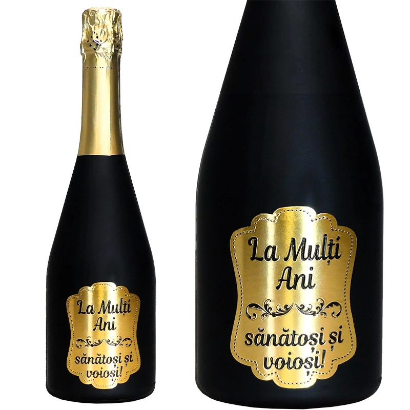 Cutia conține o sticlă de vin spumant personalizată cu mesajul ales, alături de accesorii elegante, selectate pentru a completa un dar cu adevărat memorabil.